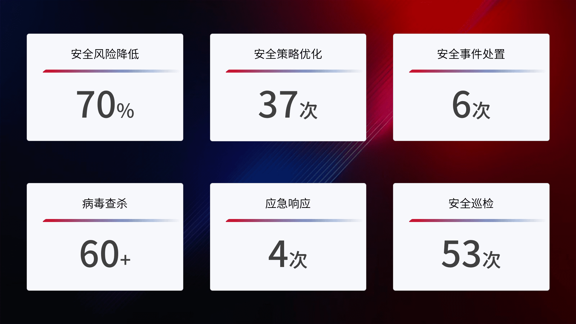 提供全面的安全事件报告体系,,,包括处置报告、、、、周报、、季度和年度总结,,,结合持续监控,,,,帮助客户深入了解网络安全状况。。